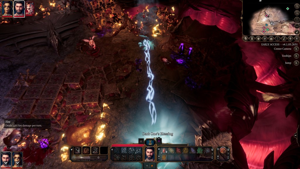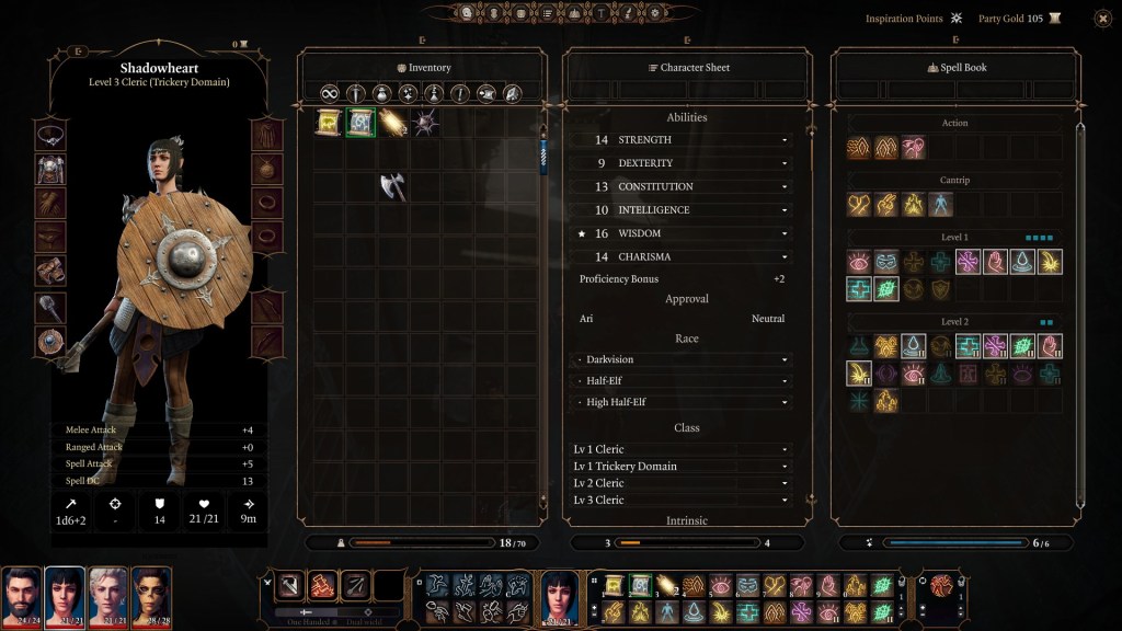 Your spells are also just kind shoved into the hotbar all willy-nilly, something I think you can reorganize, but it crams everything your character can do into it with no organization. For instance, I have a fighter in my party who can perform strikes that can cause the fear condition in an enemy. I recently leveled her up in a way where she’s received some spells she can use as well. Instead of separating those skills into folders that are marked as “fighter abilities” or “cantrips,” it’s just all kind tossed in there for you to click through along with the myriad of spell scrolls you pick up, making combat kind of a slog when it’s the turn of a magic user.