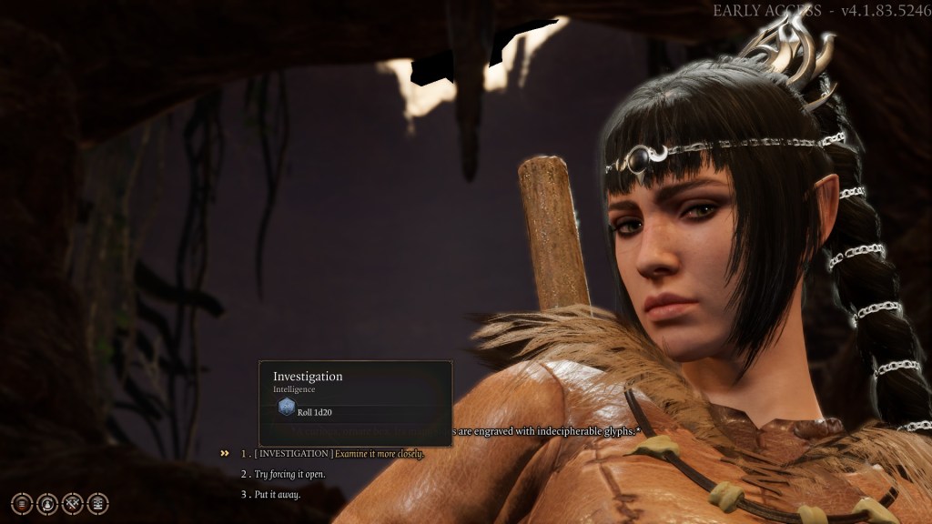 But outside of conversations and combat, it’s just weird to me how pushed into the background a lot of these checks are. Almost every skill check that occurs while exploring is transformed into a passive check. I assume the game is rolling a dice in the background, but it’s still incredibly weird that I have no say over what check I’m rolling and when. I wouldn’t mind if there was some sort of “active DM” situation that would prompt me to roll a stealth check when I wander into a bad situation unwittingly. And if I do succeed on a passive perception check it would be nice to know what it is I noticed, because virtual Ari might see it, but flesh Ari does not.