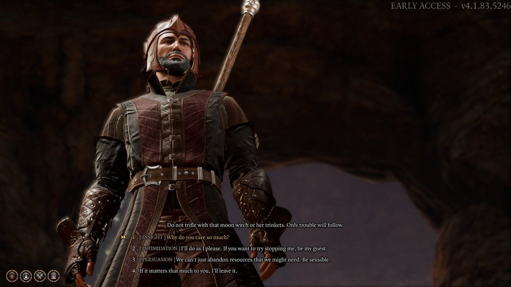 But the most infuriating example of this is in situations where you have to talk to people. Baldur’s Gate III doesn’t do a great job of incorporating the rest of your party into your conversations. Sure, their lifeless husks will loom in the background unblinking while a man tells you the sad story about his brother or whatever, but they won’t help you in any way. For instance, if my character had a super low charisma score, I’d have to live with that every single time I entered into a conversation with someone. I wouldn’t be able to let the smooth talking bard (who isn’t in the game yet) do their thing and schmooze people over, no, instead Gronk the dwarf with a brain injury is going to ruminate on the income disparities that run rampant throughout the city of Waterdeep. That’ll fucking go well.