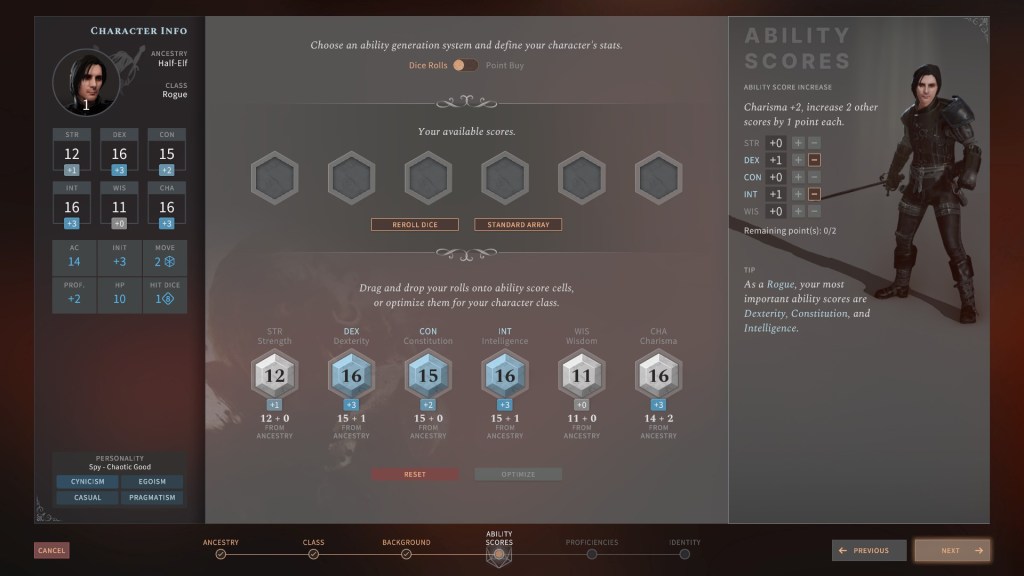 In D&D you have a core set of skills like strength or wisdom, that as you pour stat points into them you’re granted a higher modifier. A modifier is the number you add to your roll or in some cases subtract from it, representing…well your skill at a particular ability. For instance, a rogue is going to be pretty good at sneaking around, picking pockets and doing cool flips, so their dexterity score and thus, modifier are going to be higher. Without just explaining the rules of D&D anymore than I already have, the rogue would have a couple of numbers they can add to a D20 roll in order to clear the difficulty class (DC) that represents how hard what they’re attempting is.