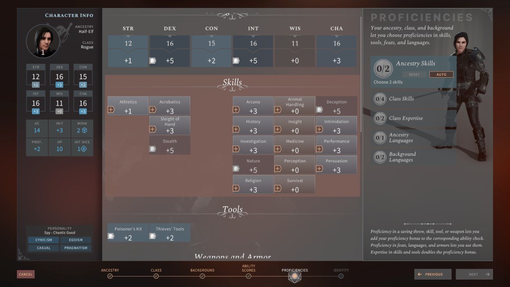 What isn’t in Baldur’s Gate III is an easy way to compare the skills and proficiencies of your characters without having to dig through a menu. So when I’m trying to break down a door or disarm a trap, I have to make an assumption on the fly of who to send to tackle said obstacle. Giving me a prompt or tool tip that just says like, “lock picking check” and then an ordered list of who in my party has the highest relevant skill for it would be nice.