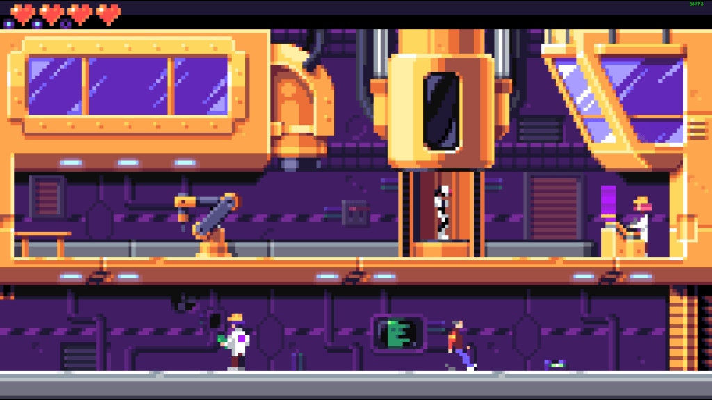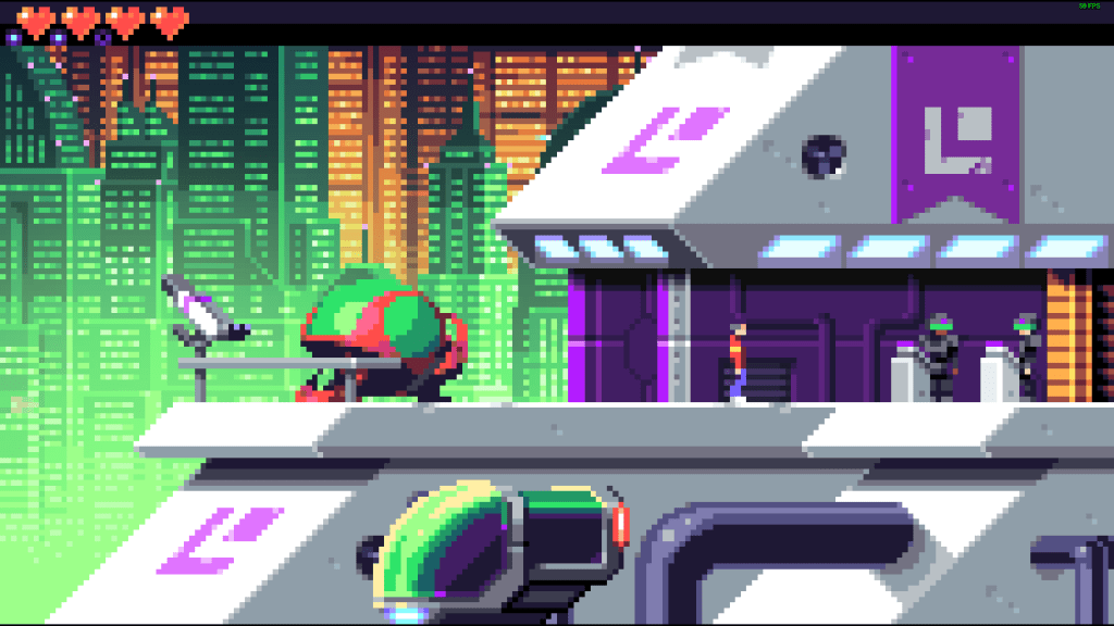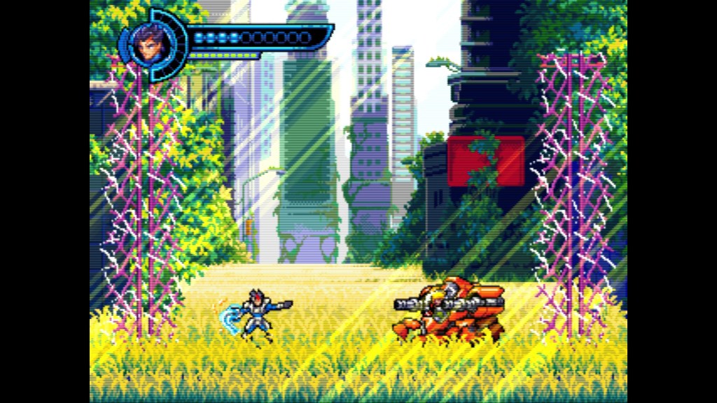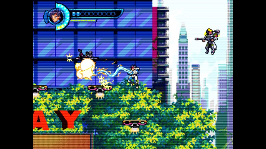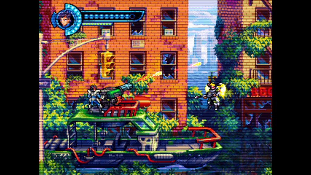 Yet despite how cool it looks, I found Steel Assault to be difficult in kind of bullshit ways. First and foremost, the enemies constantly spawn, leaving you no respite whatsoever. Now I’m sure that’s not an issue a lot of folks out there, but when I was trying to get a handle on what was going on it became incredibly frustrating. But that alone wouldn’t sour me on a nostalgia-driven action game, however what did get me was the readability of everything that was going on. I rarely have this issue in games, but I had a really hard time clocking enemy projectiles. The first sequence of the demo is you fighting a flying robot while you’re on a boat that’s speeding through the canals of a city. That robot fires bullets at you that basically vanish into the colors of the boat as well as the background, which might be more of an issue with the heavy retro-styled filter they put over the screen. I died a lot because of that.