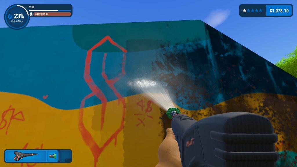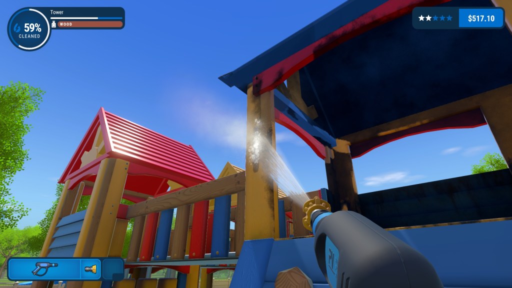 There’s no hidden mechanics here or secrets to uncover (or are there?) in PowerWash Simulator, instead you’re literally just going from building to building and blasting the gunk off of everything that’s been gunk-ified. You earn cash for completing jobs, which you can spend on upgrading your power washer via different models of washer, attachments and cleaning solutions. From there, you load into the map of a structure and methodically blast the dirt and grime off of everything, and then (pardon the wordplay) rinse and repeat until there aren’t anymore jobs available.