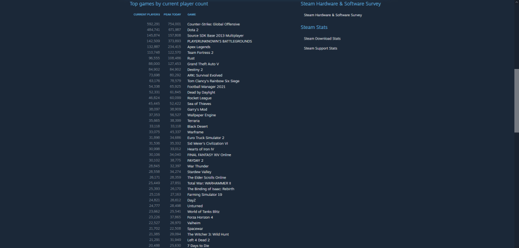 Clearly I’m just a broken individual who can’t enjoy things, because just by looking at the Steam concurrent charts you can see that the top performers are by and large older games that have endured for years thanks to their thriving and possibly toxic communities. There isn’t one game in the top 10 of this chart that came out this century. The most recent game in that selection is 2019’s Apex Legends, which Steam lists as a 2020 release because that’s when it came to Steam itself. Yet here I am unable to fathom playing any of the games on that list that weren’t released in 2021 for some reason, one of which might be my weird desire to stay up to date on video games for the purpose of having things to write about on this site.