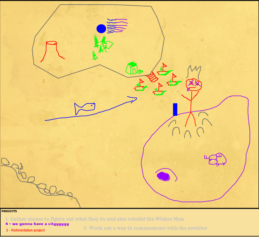 While everything was admittedly funny, our community was in shambles and spiraling out of control. Some people in the community were doing everything they could to push food production and shelter, but most of them were pretty hellbent on pleasing the wicker-man. Unfortunately for them an ill omen in the form of a storm came through and ravaged basically the wicker-man and nothing else, not even the small and seemingly abandoned huts that were constructed around it. What a weird thing to have happened.