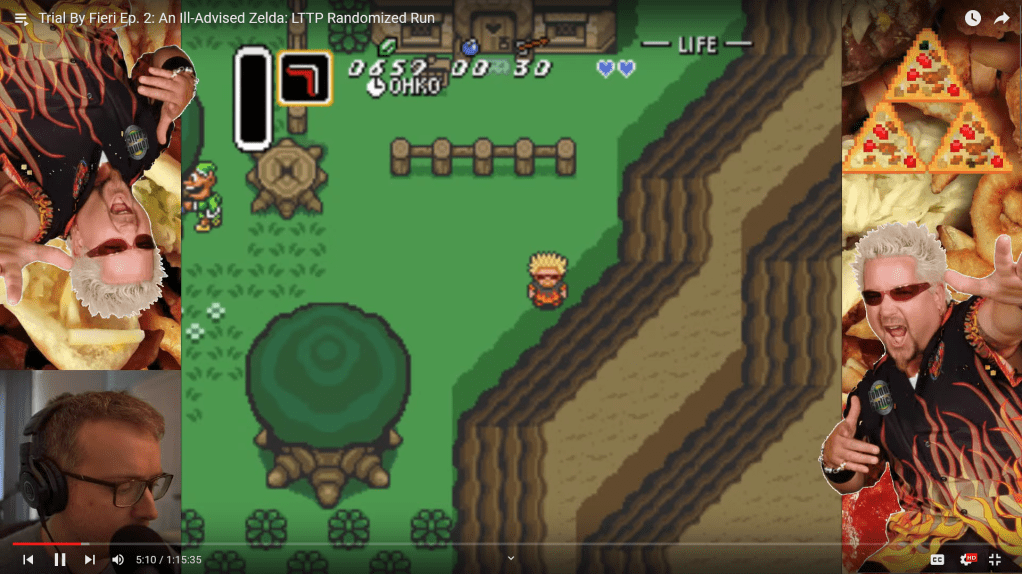 This is probably going to be a theme in these Spotlights going forward, but I’m a big fan of the McElroy Family and a lot of their content, including the very funny Trial By Fieri: An Ill-Advised LTTP Randomized Run. To break the title down for those who just see a jumble of nonsensical words, Trial By Fieri: An Ill-Advised LTTP Randomized Run, is a randomized playthrough of the Legend of Zelda: Link to the Past, where all of the items and enemies have been jumbled up, and Link has been replaced with an excellent Guy Fieri sprite that dies in one hit.