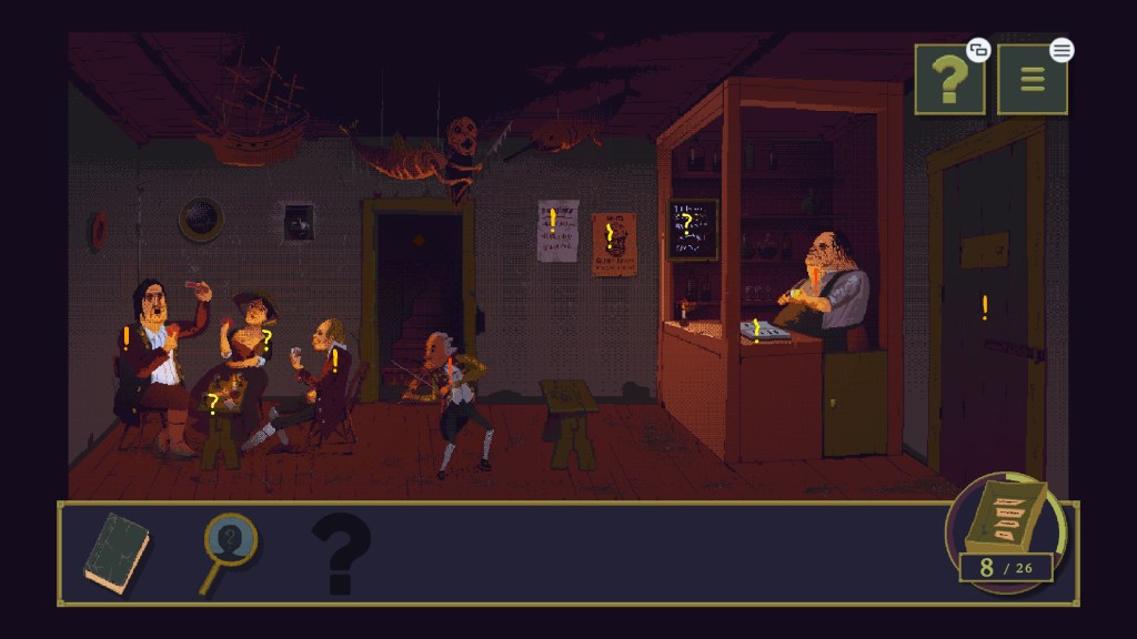 It isn’t clear who or what you play as in The Case of the Golden Idol, but you inhabit some sort of third party spectator who arrives at the moment of, or shortly after a grizzly murder has taken place. Through a point-and-click interface, you explore each heinous tableau, rooting around pockets, cupboards, and trashcans for pieces of information that can steer you towards identifying who people are, who was present, and what motives existed. At the end of each level you input your assumptions into a Mad-Libs-styled notepad, filling out the story with its key figures, items and whatever other relevant information is needed.